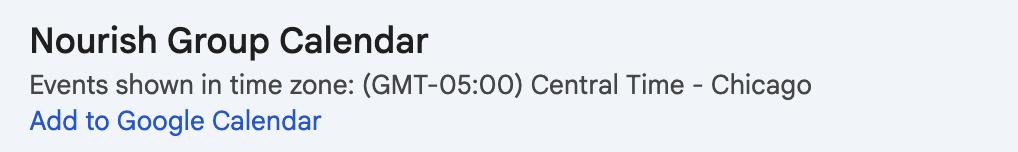 You can join meetings directly from the Nourish Group Calendar! Click the 'Add to Google Calendar' button so it can be shown on your Nourish Google Calendar.