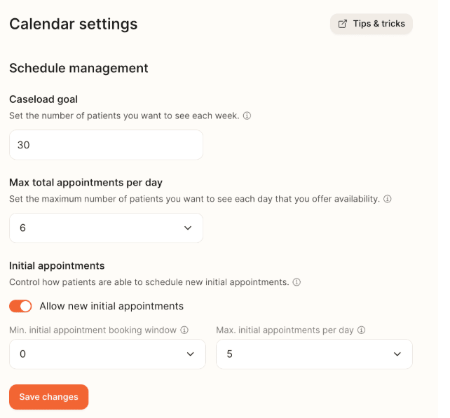 Double-check that this setting is turned on in your Provider Portal. It’s essential for accepting new patients; if it’s off, only follow-ups can be scheduled. RDs who keep new patient bookings on have the most stable schedules and are most likely to be at their caseload goals. Rather than toggling off entirely, you should strategically add calendar blocks for the days you’re unavailable. This ensures patients can still find you—and book ahead—during high-demand periods.